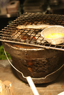We take our seats and are handed menus, some Asahi beer quickly follows as we make up our minds of what to partake in. Leaving the decisions to my fantastic hosts, I sit back ready to indulge. Two small cast iron pots filled with very hot coals is placed in front of us and a small wire mesh screen is placed on top. Soon after our food arrives. Anchovies, octopus, very thinly sliced beef and various other meats and seafood.... all raw. I can figure out what's next, so chopsticks in hand I toss some on. Something about food cooking in front of my eyes is a sight I'll never take for granted. The beauty of that process, to see the colours change and the smells begin to mix causing a mouth watering effect.